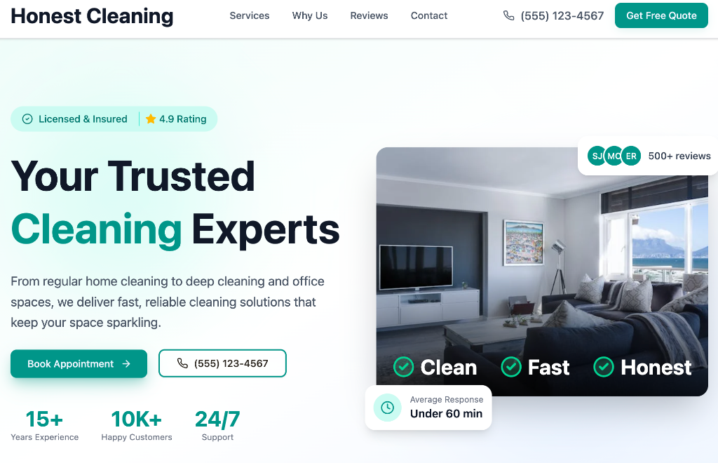 A beautiful website that helps people find cleaning services fast. It shows prices instantly and gets more customers.